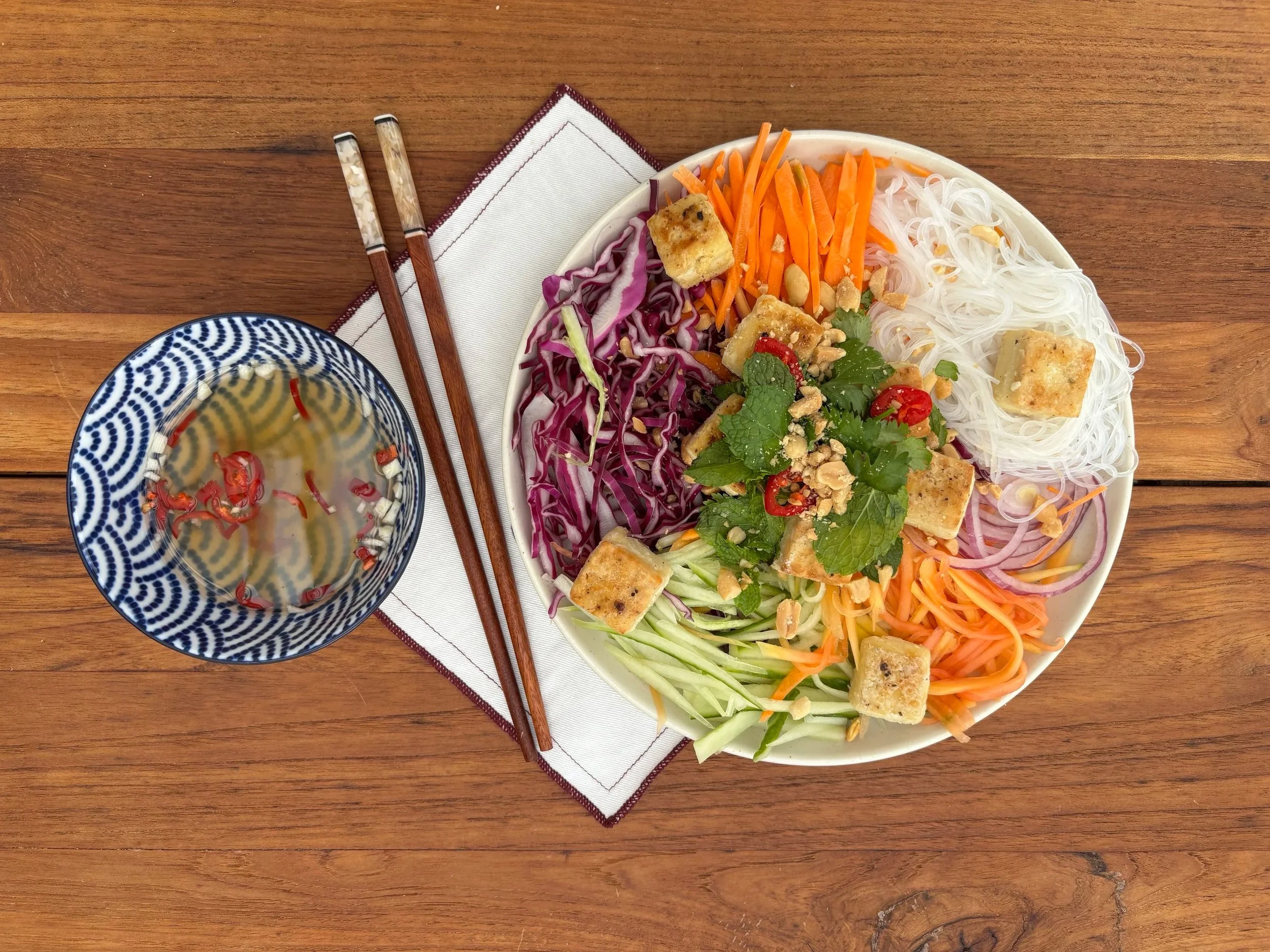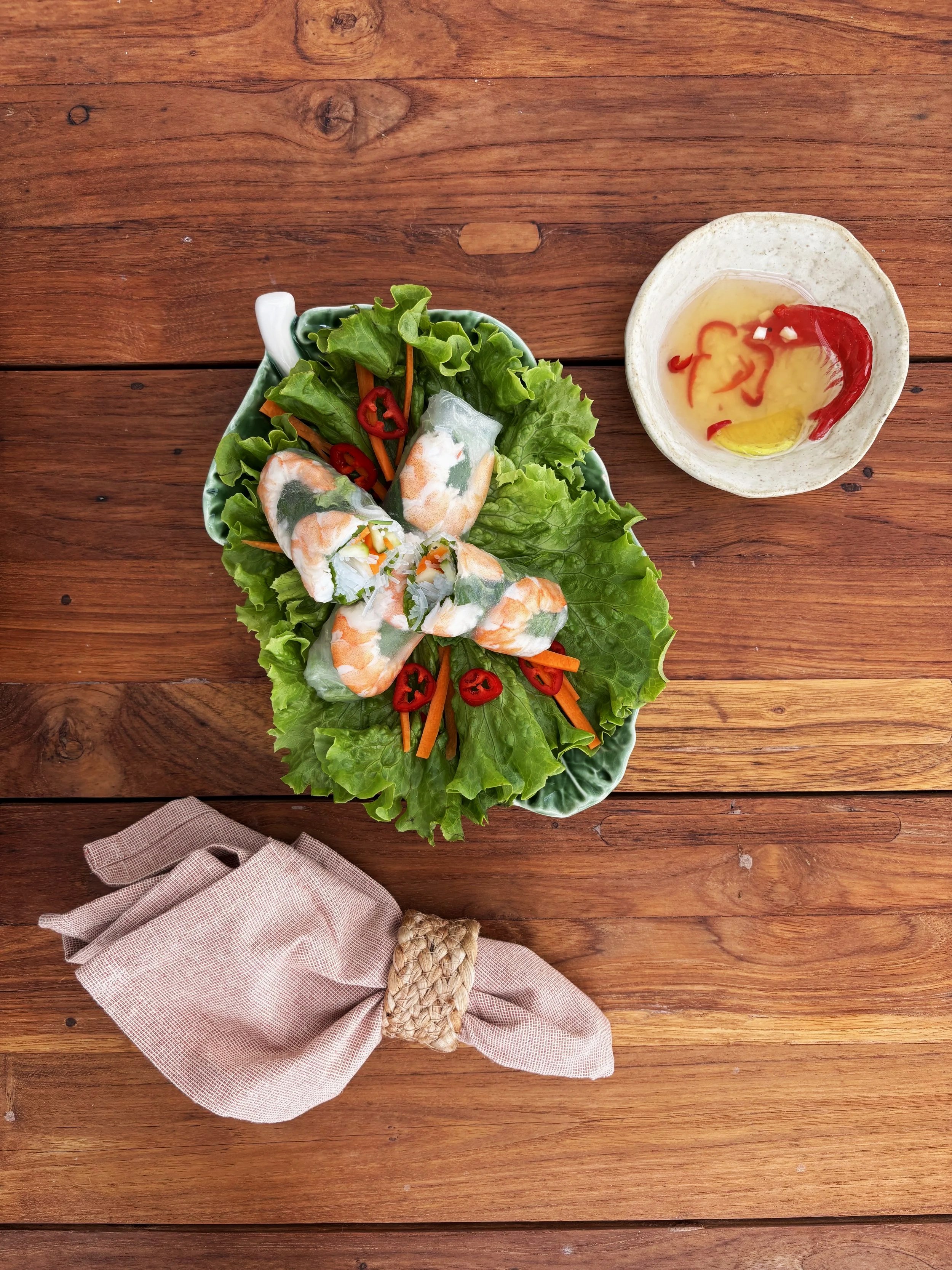 Rice paper rolls filled with rice vermicelli, vegetables, fresh herbs and Vietnamese nuoc cham sauce.
