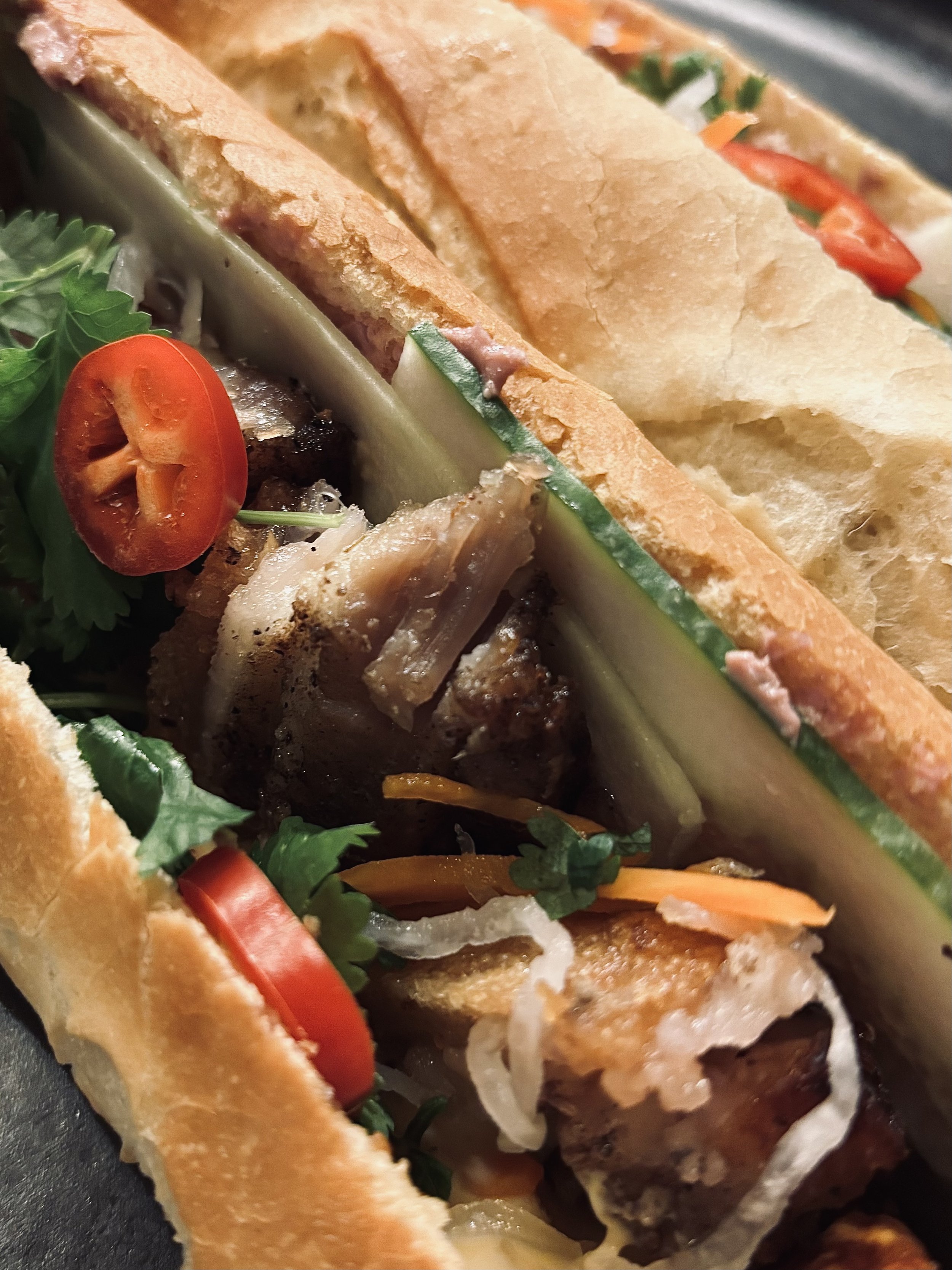 Sandwichs Bánh Mì- Baguette garnie de pâté de foie de poulet, mayonnaise, carottes et radis blanc marinés, concombre, piment et coriandre.