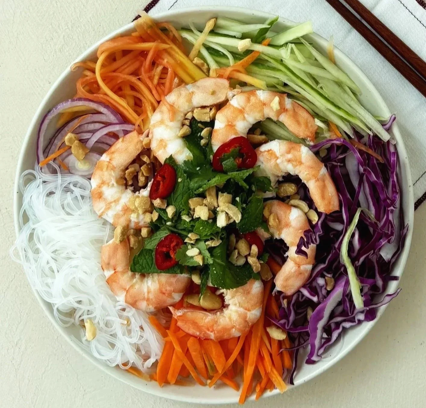 Vermicelli, couve roxa, cenoura, pepino, cebola roxa, papaia verde, malagueta, amendoins e ervas aromáticas